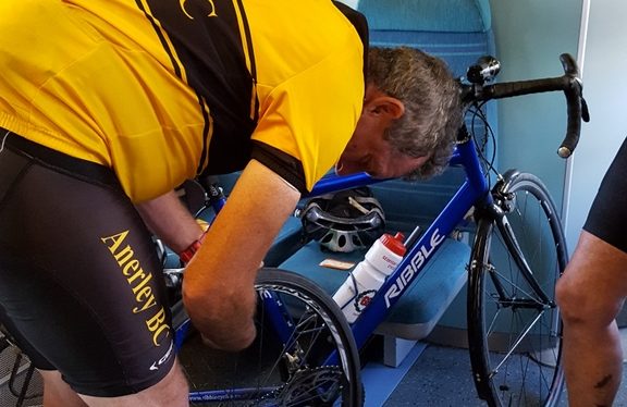 The route had superb views, weather and a cheap train ride home which included free entertainment as Brian demonstrated how not to put a tyre back on a wheel.
