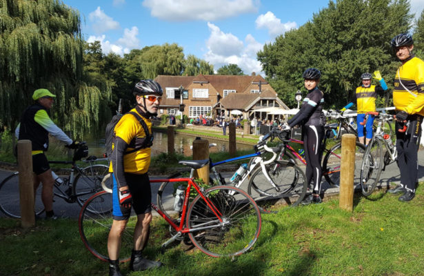 Usually its a straight run home after the pub but Tom had other things in mind as we set off in the opposite direction towards Woking and then snaking south to East Clandon and West Horsley. The return was up Little Switzerland but a fairy caught Maggie’s front wheel as we crossed the A24. a great but unexpectantly longer ride than usual.