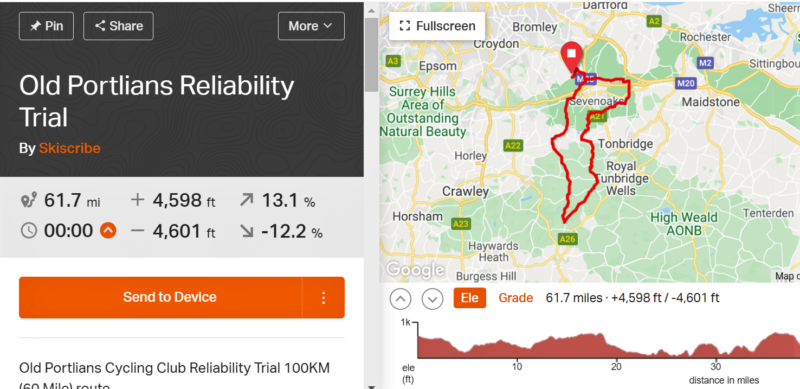 I do not have a GPS route for the Hell of the Ashdown Challenge, but I do have it for the similar Portlians 100km Reliability Ride, which Bryn did 2 weeks later. This is basically the same route but in reverse (clockwise) and shows 4,598 ft of climbing.