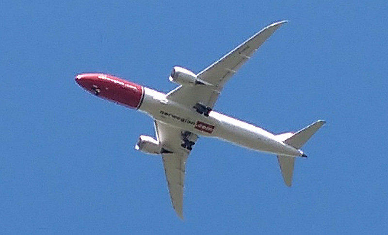 An unremarkable pub with only one draught beer but a rather nice garden the wasps were enjoying even more than us – or was it us? The burger [above] was a mountain to climb – and its unique position directly under Gatwick Approach gave us yet another opportunity to refine our planespotting skills. Here – a Norwegian Boeing 787 Dreamliner inbound from Rio after a 10 hour flight: