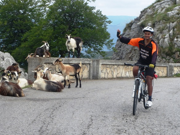 Last year our summer cycle tour took us into the mountainous terrain of northern Spain. Of my three companions, Ricky was the mountain goat, racing up each and every hill, leaving the rest of us trailing in his wake. But after a couple of weeks of daily grinds we were all beginning to feel at home with our cloven companions, as demonstrated here by a smiling Christopher.