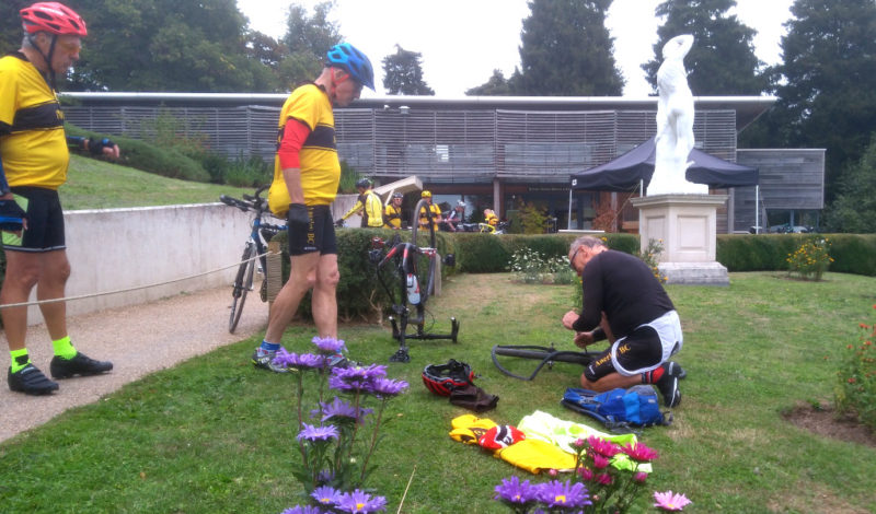 We moved on past Leatherhead to the wastelands of Bookham and Effingham before rolling up at Painshill Park. Parts of which may be familiar to viewers of ITV’s Vanity Fair. During refreshments the puncture fairy had stolen up on Frank’s bike: