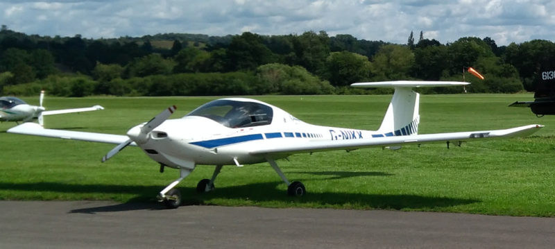 Diamond DA20-C1 Eclipse. Lots of these about. It’s a favourite as a low cost trainer. Still cost you over $200,000 for only two seats. It was Austrian designed but most were built in Canada. It’s design and handling is heavily derived from the manufacturer’s expertise in building gliders. It’s a plastic shell and has a charateristic castering nosewheel and high tailplane.