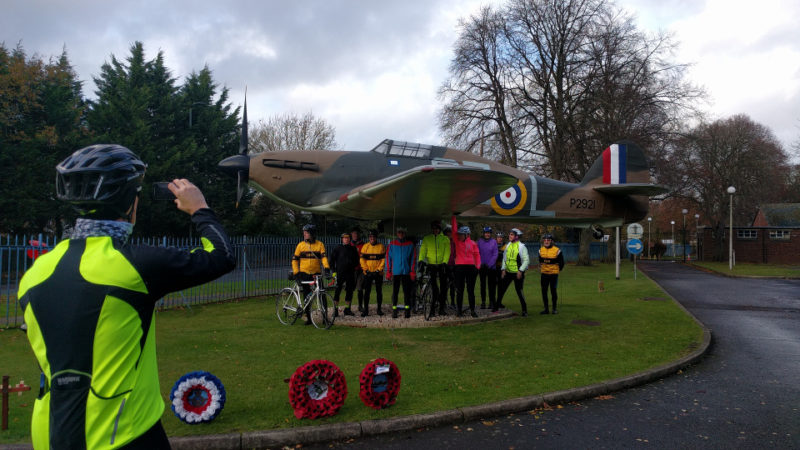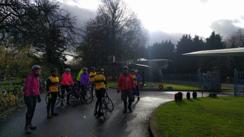John D led fourteen of us on a rain threatening day to Biggin Hill. Given the conditions and the detritus and flooding left over from Storm Angus we stuck more to the main roads than usual. Sadly that didn’t exclude the killer climb past Keston Church. Then through Downe to the Look Out Cafe overlooking the airfield where John & Meike awaited us.
