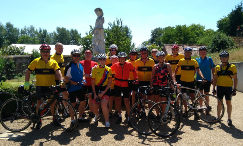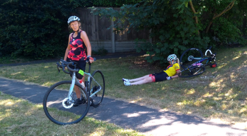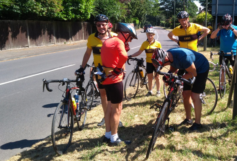 No 9:30 ride so we were a big group on a very hot day following Des on a Byzantine route out around Banstead to Epsom Downs and Ashtead. This featured an extended mechanical as Barrie attempted to fish the VO2 chain out its entanglement. This gave the rest of us {above and below] a pleasant opportunity to sharpen our tan lines.