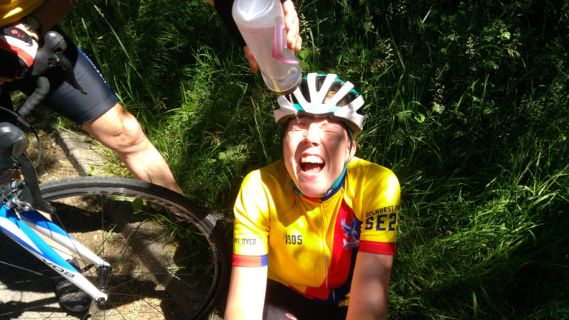 Another innovative route across Fetcham Common which was a bit dusty to Leatherhead. Then down to Dorking by-pass where the silly division decided on Box Hill whilst the sensibles took on Little Switzerland. If that was bad enough, the final grind up to Headley Common was tortuous. Viv taking drastic measures to cool down: