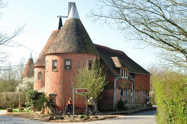 Kent has long been known as the Garden of England, and as we pedaled up the hill into the lovely village of Chiddingstone we had sweeping views of green fields and hedgerows, stretching into the distant high ground of the Weald. And what could be more representative of the farming tradition of the hop fields of the Garden of England than it’s many oast houses.