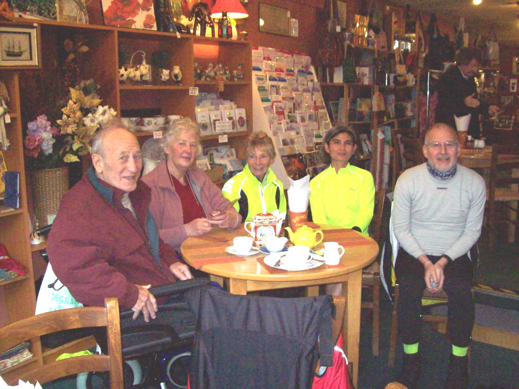 But this was not the end of John’s pneumatic drills. Ninety minutes and 15 miles further on it was Sandra’s turn to suffer the deflating effects of a slow puncture. She managed to get to our tea stop, where noble John came to the rescue of our damsel in distress and did another quick inner tube change. What a gent. Who said that chivalry was dead?