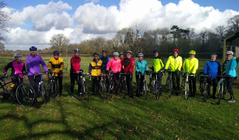 John Dr shows off his vintage and restored Raleigh ‘Kellogs’ Pro Tour from around 1988. A great start on a day that only got better with sixteen of us stiing off up Portnalls as the sun won the battle of the early morning cloud to make a wonderful sunny ride. Barrie led us down Reigate and trumpet’s Hills out to Tanhouse Farm beating young John T and Meike to the Beef & Ale Pies.