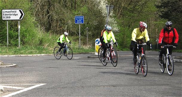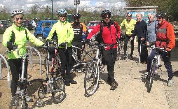 After a damp Easter Sunday and much wetter Monday, the sun came out for our Tuesday ride. To make up for the zero turn out on Sunday we had a full compliment on this occasion.  Sandra, back from her visit to New Zealand (there must be something worthwhile to write about?), Julia full of the joys of spring, a welcome return on a Tuesday by Graham, Brompton mounted Stuart (our photographer), and two who only just made it in time, Tom and Chris Vaz.