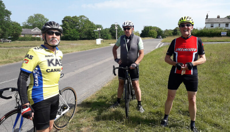Next John Di with Jim K, Roger F, Vince H, and Robert H. We went through Sanderstead village (and past my old primary school for personal nostalgic reasons) and out along Limpsfield road to the top of Titsey, then down Clarks Lane until turning left onto the Pilgrims Way. This is a popular cycle route for good reason; vineyards on our right, great views, and rolling lanes with little other traffic. The route then took us down to Brasted followed by the 2 mile climb of Toys Hill – again, this appeared to be a very popular route choice! We had no use for the defibrillator or oxygen at the top, but we did regroup outside the Fox and Hounds pub (which is for sale as a residential property if anyone is interested). The hill up gave a marvellous downhill payback, although great care was required due to a couple of corners and a poor road surface. Heading towards Edenbridge we went through Four Elms and seeing an open shop selling coffee and cake I decided not to gamble on Edenbridge, so we stopped for a good coffee and chat, or possibly a good chat and coffee. We caught up on cycling experience under lockdown, and Vince was interested in getting feedback on the booking sheet. Well done for implementing so quickly!