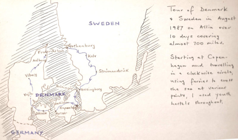 The harbour was my next objective, so into town I rode, bought a ticket for the ferry to Nyborg the next day, then back to the hostel. An American cyclist had arrived, a young man from Oregon, with his low-loaders, no mudguards, one brake (at the back), and 18 gears. He was heading for the Alps and Austria and I wondered how he would fare with his one brake . . .