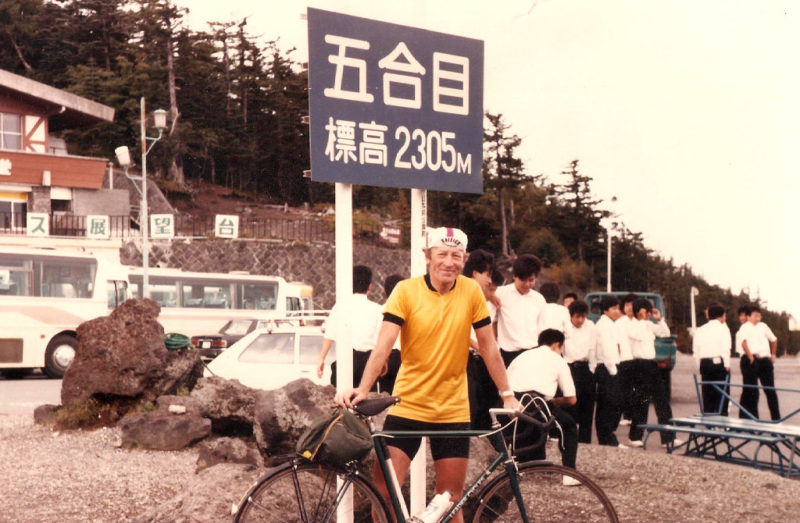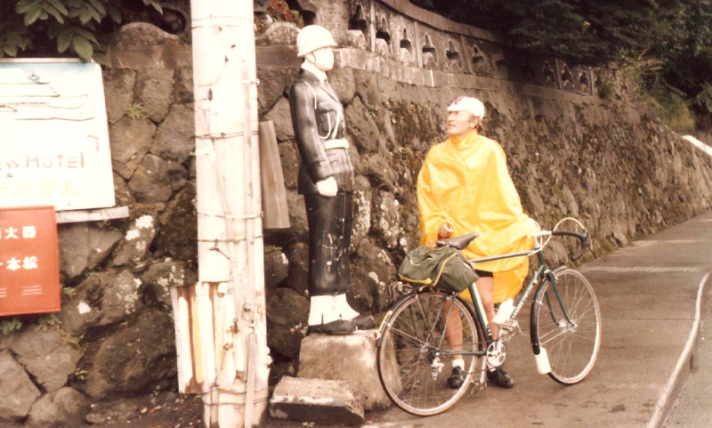 Meandering back up the mountain to Sagamiko we were passed by a couple of racing men, complete with white dome helmets. Each rode a track bike, fixed heel, gear of about 80 inches and each had one brake — on the back wheel!
