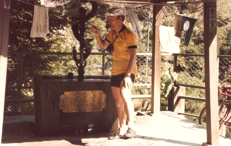 At that moment a Japanese cyclist came into view and stopped at the fountain. He was, I guessed, about 40 and looked fit.