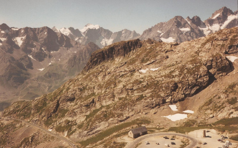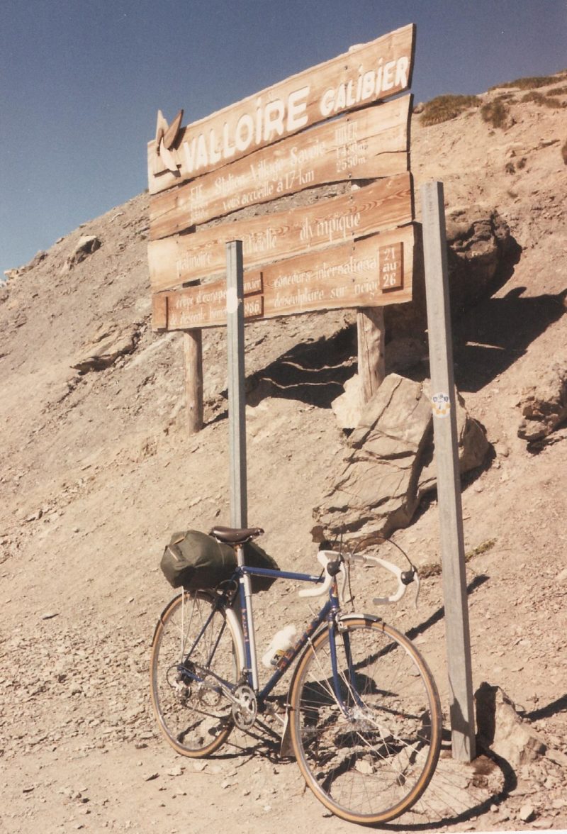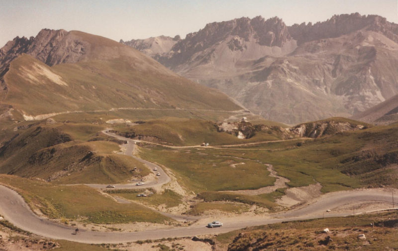 Sweat trickled from my cap in a constant stream, and every five or six kilometres I had to stop to rest and drink. On restarting, the going seemed easy, but within a kilometre it reverted to a painful plod. After a fruitless diversion up five kilometres of dead-end track in search of a gite which, it transpired, had no spare bed, I resumed my plod up the Télégraphe. The utter relief at reaching the summit and then dropping like a stone to the mountain ski resort of Valloire was indescribable. The town appeared “en féte”, with pennants flying everywhere, people basking in the bright sunshine and sitting beneath huge, splendid parasols while sipping ice-cold drinks.